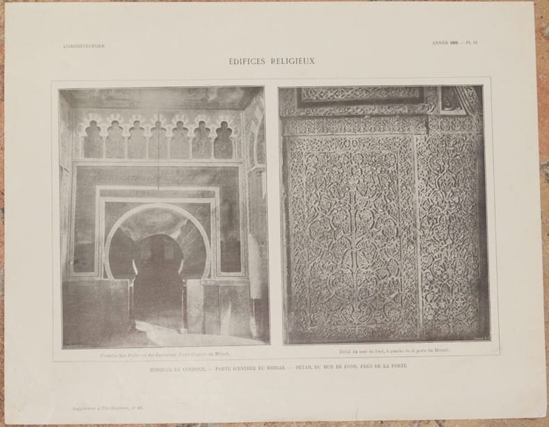Bella litografia di architettura supplemento de "L'architecture" del 1905. La stampa mostra una sala della Moschea di Cordoba.TECNICA: Litografia DIMENSIONI FOGLIO: cm 27,5X35 DIMENSIONI INCISIONE: cm 18,5x29 EPOCA: 1905 CONDIZIONI: Buone condizioni. Fioriture e strappi marginali Beautiful lythography of 1905 taken from the work "L'architecture" of 1905. The print represents a view of Mosque in Cordoba. TECHNIQUE: Lythography PAGE SIZE: cm 27,5X35 PRINT'S SIZE: cm 18,5x29 PERIOD: 1905 CONDITION: good conditions. Foxings