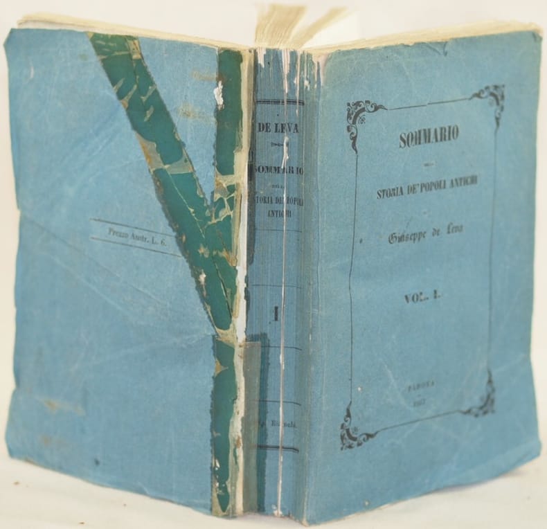 In 8. Dim. 23,5x15 cm. Pp. 566. Interessante opera del 1856 sulla storia dei popoli antichi scritto da Giuseppe de Leva. Sebbene in copertina sia presente l'indicazione "vol. I", l'opera è in un volume ed è completa. All'interno: gli egiziani (geografia, Valle del Nilo, storia, cultura), i semiti (antico Impero babilonese, cultura, industria e commercio, fenici, Assiri) Indiani, Battriani medi e persiani, Greci, Macedoni, romani ecc... In discrete condizioni. Copertina editoriale in mediocri condizioni generali con usure ai margini e dorso. Piatto posteriore staccato e segni di nastro adesivo. Legatura in discrete condizioni con rotture. All'interno le pagine si presentano in ottime condizioni con fioriture. Interesting work of 1856 about the history of ancient people written by Giuseppe de Leva. Even if in the cover there is the indication "vol. I", the work is in one volume and it is complete. Inside: egyptians (geography, Nile Valley, history, culture), jewish (Ancient Babilonian Empire, culture, industry and trade, phoenix, Assiri) Indians, Battriani medians and persians, Greeks, Macedoni, romans ecc... In fair conditions. Editorial cover in poor general conditions with wearings in the edges and spine. Back plate is detached and signs of adhesive tape. Binding in fair conditions with cracks. Inside pages are in very good conditions with foxings.