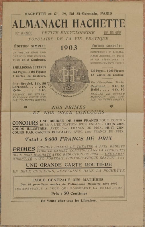 In 8. Dim. cm 20,5x13. Pp. (4). Interessante depliant pubblicitario dell'Almanach Hachette del 1903 All'interno i vari argomenti trattati e alcune illustrazioni dei cosidetti "freaks": Uomo caoutchouc, l'uomo cane. Inoltre l'ammestratore del mammouth più grande al mondo. In ottime condizioni, piegature. Interesting advertising depliant of Almanach Hachette of 1903. insdie the different arguments of articles and illustrations of the so-called "freaks": caoutchouc man, the dog man. Then the educator of the biggest mammouth in the world. In very good conditions, foldings.