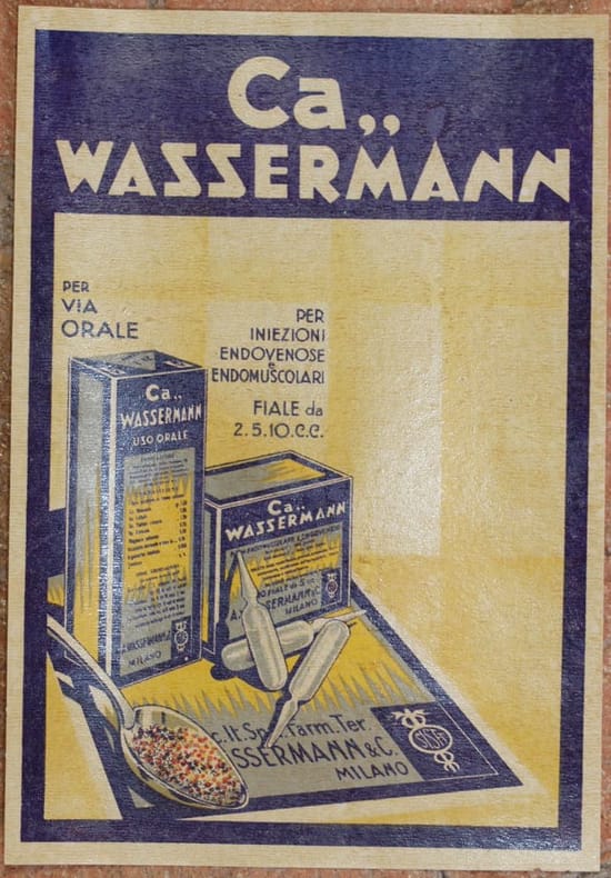 In 16. Dim. cm 15x10,5. Delizioso volantino pubblicitario della medicina "Wassermann". Senza data ma degli anni '40. In ottime condizioni. Nice advertising pamphlet of the medicine "Wassermann". Not dated but of 1940's. In very good conditions.