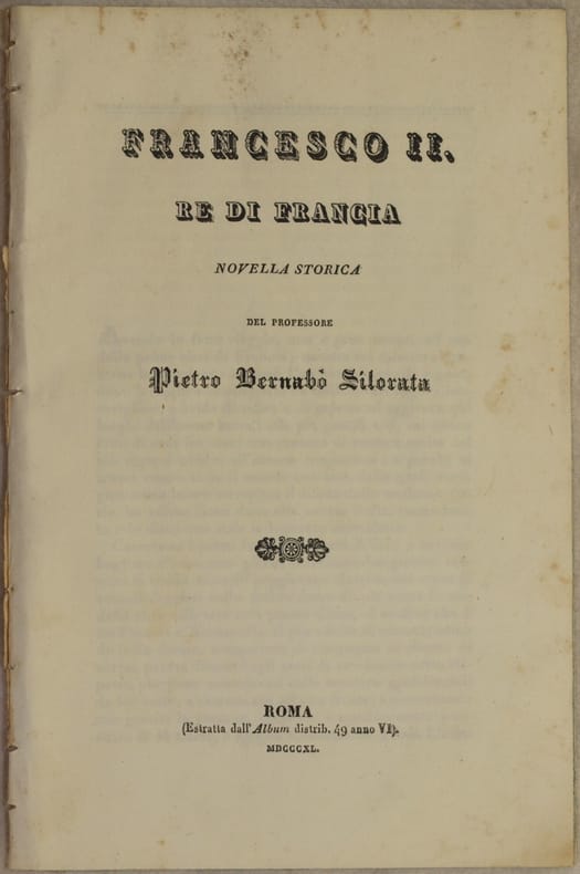 In 8. Dim. 19,5x13 cm. Pp. 22. Prima edizione del 1840 di questa rarissima novella storica del letterato, poeta e traduttore nato a Porto Maurizio (Imperia) Pietro Bernabò Silorata (1808-1886). Estratto dall'Album distrib. 49 anno VI In buone condizioni e completa Copertina assente. Legatura quasi assente. All'interno le pagine si presentano in buone condizioni con fioriture. First edition of 1840 of this work by the letterate, poet and translator born in Porto Maurizio (Imperia) Pietro Bernabò Silorata (1808-1886). Estratto dall'Album distrib. 49 anno VI. In good conditions and complete. Cover is missing. Binding is almost missing. Inside pages are in good conditions with foxings.