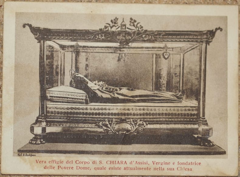 In 24. Dim. cm 7x9,5. Immaginetta sacra del corpo di Santa Chiara D'Assisi degli anni '50 circa. Al verso preghiera alla Santa. In buone condizioni, piegature e usure ai margini, note manoscritte. Holy image of the body of Santa Chiara D'Assisi not dated but of 1950's. In the verso prayer to the Saint. In good conditions, wearings and missing parts in the edges.