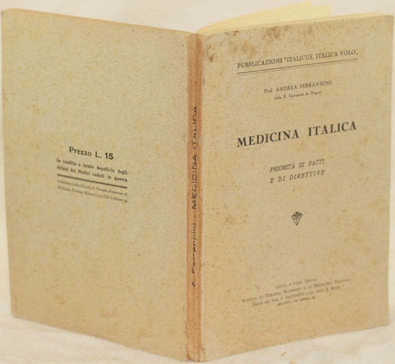 In 8. Dim. 23x16,5 cm. Pp. 174+(2). Edizione senza data ma degli anni '50 di questo volume di medicina scritto dal Prof. Andrea Ferrannini della Regia Università di Napoli. All'interno aggiornamenti su diverse materie: microscopia e biochimica, Biologia della procreazione, ginecologia e ostetricia, citologia, sangue, microbiologia, endocrinologia, oncologia, tubercolosi, infezione palustre, colerosa, rabbia, pneumococcica, tetanica, carbonchiosa, leishmaniosi, scarlattina, cuor, apparato repsiratorio e digerente, urologia, neurologia, elettrologia, oftalmologia, stomatologia, dermatologia, medicina legale, Croce rossa ec... In ottime condizioni. Copertina editoriale in ottime condizioni generali con lievi usure ai margini e dorso. Legatura in ottime condizioni. All'interno le pagine si presentano in ottime condizioni con rare fioriture. Not dated edition but of 1950's of this volume of medicine written by Prof. Andrea Ferrannini of the Regia Università di Napoli. Insie upgrades on different issues: microscope and biochemistry, Biology of procreation, ginecology and obstetrics, citology, blood, microbiology, endocrinology, oncology, tubercolosis, infezione palustre, cholera, rabbia, pneumococcica, tetan, carbonchio, leishmaniosi, scarlattina, heart, breathing and digestive system, urology, neurology, electrology, oftalmology, stomach, dermatology, legal medicine, Red Cross ec... In very good conditions. Editorial cover in very good general conditions slightly worn in the edges and spine. Binding in very good conditions. Inside pages are in very good conditions with occasional foxings.