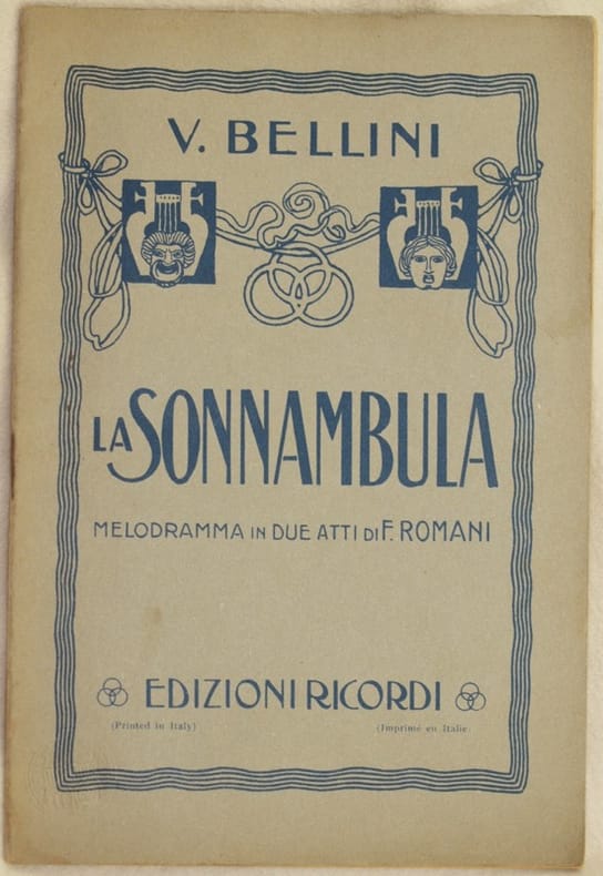 Bel libretto d'opera del 1934 dell'opera in due atti "La sonnambula" del compositore italiano Vincenzo Bellini (1801-1835) su libretto di Felice Romani. La prima rappresentazione ebbe luogo al Teatro Carcano di Milano il 6 marzo 1831.<BR>In buone condizioni. Brossura editoriale in buone condizioni generali con lievi usure ai margini e dorso. Legatura in buone condizioni. All'interno le pagine si presentano in ottime condizioni con rare fioriture. In 16. Dim. 18,5x12 cm. Pp. 32. Booklet of 1934 of the work "La sonnambula" by Vincenzo Bellini (1801-1835) on booklet by Felice Romani The first representation took place the 6th of march 1831 in Theatre Carcano in Milan. In good conditions. Editorial cover in good general conditions slightly worn in the edges and spine. Binding in good conditions. Inside pages are in very good conditions with foxings. In 16. Dim. 18,5x12 cm. Pp. 32.