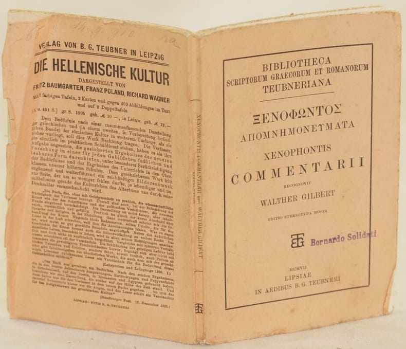 In 16. Dim. 18,5x12 cm. Pp. (6)+150. Edizione del 1907 di questo commentario di Senofonte a cura di Walther Gilbert. Riassunto e indice in latino, testo in greco. In buone condizioni Copertina editoriale in buone condizioni generali con lievi usure ai margini e dorso. Legatura in buone condizioni. All'interno le pagine si presentano in buone condizioni con fioriture. Edition of 1907 of this commentary of Senofonte by Walther Gilbert. Resuminga nd index in latin, text in greek language. In good conditions. Editorial cover in good general conditions slightly worn in the edges and spine. Binding in good conditions. Inside pages are in good conditions with foxings.