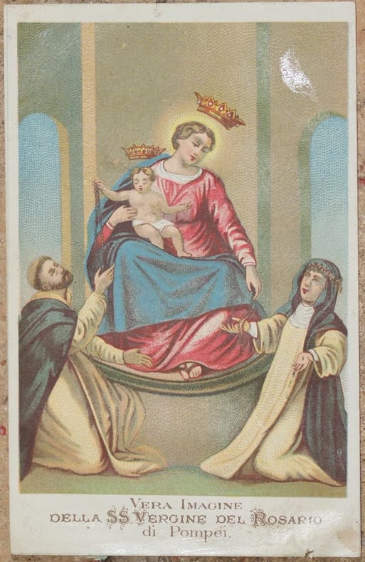 Immaginetta sacra in cromolitografia della Santissima Vergine del Rosario di Pompei. Al verso preghiera. Senza data ma dei primi del novecento. Resto di etichetta al verso. In buone condizioni. In 24. Dim. cm 11,5x7. Holy image of chromolytography of Very Holy Virgin of Rosario in Pompei. Not dated but of the first years of 1900. Piece of label in the verso. In good conditions.
