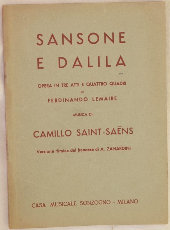 In 8. Dim. 19x13,5 cm. Pp. 39. Edizione del 1936 del libretto d'opera dell'opera "Sansone e Dalila" di Camillo Saint Saens su libretto di Ferdinando Lemaire. In buone condizioni. Bella brossura editoriale illustrata. Brossura editoriale in ottime condizioni generali con lievi usure ai margini e dorso. Legatura in buone condizioni. All'interno le pagine si presentano in ottime condizioni con rare fioriture. Edition of 1936 of the booklet of the work "Sansone e Dalila" by Camillo Saint Saens on booklet Ferdinando Lemaire. In good conditions. Editorial cover. Editorial cover in good general conditions slightly worn in the edges and spine. Binding in good conditions. Inside pages are in very good conditions with occasional foxings.