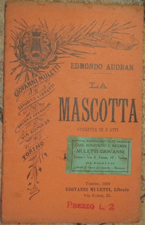 In 16. Dim. 18,5x11,5 cm. Pp. 32.Bel libretto d'opera del 1909 dell'opera in tre atti "LA mascotta" di Edmond Audran (1842-1901). In buone condizioni. Bella brossura editoriale illustrata. Brossura editoriale in buone condizioni generali con lievi usure ai margini e dorso. Legatura in buone condizioni. All'interno le pagine si presentano in ottime condizioni con rare fioriture. Beautiful booklet of the work "La mascotta" by Gioachino Rossini (1792-1868) on booklet by Jouy e Bis from the drama by Edmond Audran (1842-1901). In good conditions. Illustrated editorial cover. Editorial cover in good general conditions slightly worn in the edges and spine. Binding in good conditions. Inside pages are in very good conditions with occasional foxings.