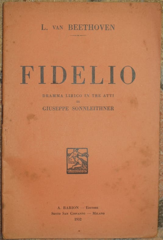 In 16. Dim. 18,5x12,5 cm. Pp. 32. Bel libretto d'opera del 1932 dell'opera in tre atti "Fidelio" di Ludwig Van Beethoven su libretto di Giuseppe Sonnleithner. La prima rappresentazione ebbe luogo il 15 maggio 1883 a Milano nel Teatro dal Verme. In buone condizioni. Bella brossura editoriale illustrata. Brossura editoriale in buone condizioni generali con lievi usure ai margini e dorso. Legatura in buone condizioni. All'interno le pagine si presentano in ottime condizioni con rare fioriture.Beautiful booklet of 1932 of the work in three acts "Fidelio" by Ludwig Van Beethoven on booklet of Giuseppe Sonnleithner. The first representation took place the 15th of may 1883 in Milan in Teatro dal Verme. In good conditions. Editorial cover. Editorial cover in good general conditions slightly worn in the edges and spine. Binding in good conditions. Inside pages are in very good conditions with occasional foxings.