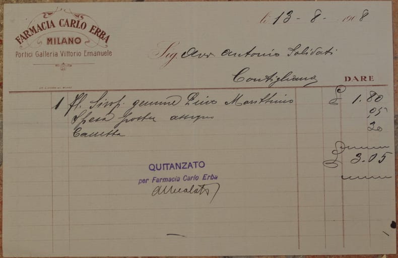 In 8. Dim. cm 14x21,5. Bella fattura del 13 agosto 1908 della ditta "Farmacia Carlo Erba" di Milano. Lista del materiale acquistato. In buone condizioni, piegature. Beautiful invoice of the 13rd of august 1908 of the firm "Farmacia Carlo Erba" in Acqui. List of material purchased. In good conditions, foldings.