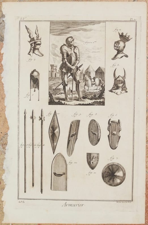 Bella incisione su rame di grandi dimensioni del 1770 circa tratta dalla famosa Enciclopédie de Diderot & D'Alembert. L'incisione rappresenta armature, scudi e lance. TECNICA: Incisione su rame DIMENSIONI FOGLIO: cm 40,5x26,5 DIMENSIONI INCISIONE: cm 35x22 EPOCA: 1770 circa CONDIZIONI: Buone condizioni, qualche fioritura. Usure ai margini in barbe. Parti mancanti al margine sinistro. Beautiful copper engarving of big size of 1770 circa taken from the famous Enciclopédie de Diderot & D'Alembert. The engravings represents armours and weapons. TECHNIQUE: copper engraving PAGE SIZE: cm 40,5x26,5 PRINT'S SIZE: 35x22 PERIOD: 1770 circa CONDITION: good conditions. Foxings. Worn uncut edges. Missing parts in the left edge.
