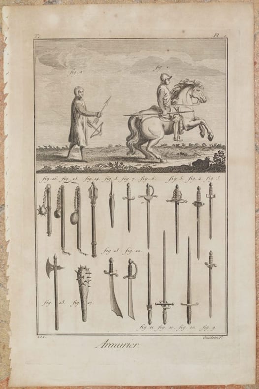 Bella incisione su rame di grandi dimensioni del 1770 circa tratta dalla famosa Enciclopédie de Diderot & D'Alembert. L'incisione mostra un cavaliere che si allena, spade e armi. TECNICA: Incisione su rame DIMENSIONI FOGLIO: cm 40,5x26,5 DIMENSIONI INCISIONE: cm 35,5x21,5 EPOCA: 1770 circa CONDIZIONI: Buone condizioni, qualche fioritura. Usure ai margini in barbe. Parti mancanti al margine sinistro.Beautiful copper engarving of big size of 1770 circa taken from the famous Enciclopédie de Diderot & D'Alembert. The engravings represents a training of a knight, some swords and weapons. TECHNIQUE: copper engraving PAGE SIZE: cm 40,5x26,5 PRINT'S SIZE: 35,5x21, PERIOD: 1770 circa CONDITION: good conditions. Foxings. Worn uncut edges. Missing parts in the left edge.<BR><BR>