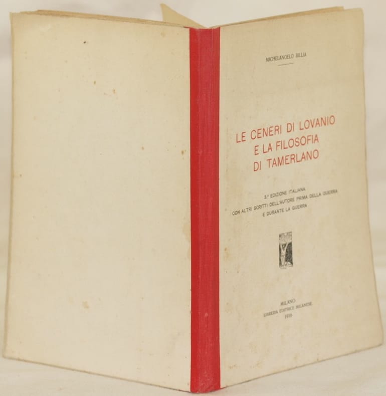 In 8. Dim. 25x17 cm. Pp. 85. Edizione del 1916 di questa opera sulla prima guerra mondiale scritta da Michelangelo Billia. Tra gli argomenti trattati: A Rodolfo Euken, La guerra all'Austria non è inevitabile (1 marzo 1915), Noi facciamo la guerra alla Germania (giugno 1915), Austria troppo vil nemico (1 luglio 1915), Al Popolo Italiano ecc... In buone condizioni Copertina in mezza tela in buone condizioni generali con lievi usure ai margini e dorso. Legatura in buone condizioni. All'interno le pagine si presentano in ottime condizioni con rare fioriture. Edition of 1916 of this work about the first world war written by Michelangelo Billia. Between the issues treated: To Rodolfo Euken, War to Austria cannot be stopped (1 marzo 1915), We make war to Germany (giugno 1915), Austria (1 luglio 1915), To Italian People ecc... In good conditions. Half cloth cover in good general conditions slightly worn in the edges and spine. Binding in good conditions. Inside pages are in very good conditions with occasional foxings.
