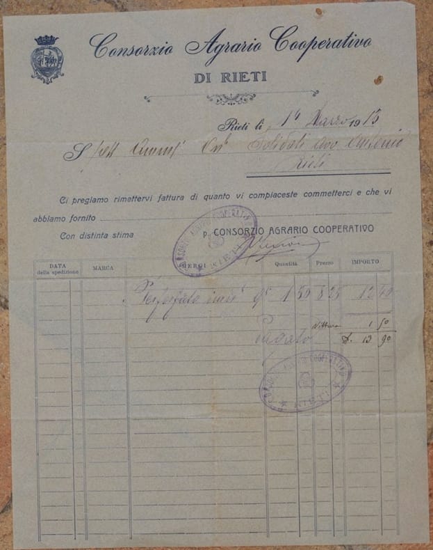 Bella fattura del 14 marzo 1913 del "Consorzio Agrario Cooperativo" di Rieti. Lista del materiale acquistato e timbro. In buone condizioni, piegature. In 4. Dim. cm 27x21. Beautiful invoice of the 14th of March 1913 of "Consorzio Agrario Cooperativo" in Rieti. List of material purchased. In good conditions, foldings.
