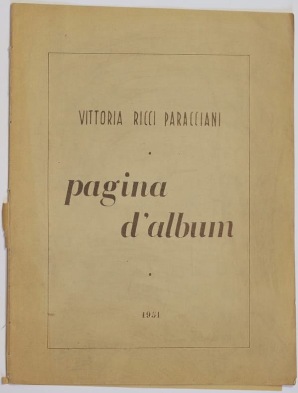 In 4. Dim. 32x24,5 cm. Pp. 11. Edizione del 1951 di questo spartito per pianoforte della melodia "Pagina d'album" di Vittoria Ricci Paracciani. In buone condizioni. Copertina editoriale in buone condizioni generali con lievi usure e parti mancanti ai margini e dorso. Legatura in buone condizioni. All'interno le pagine si presentano in buone condizioni con rare fioriture. Mende. Edition of 1951 of this musical score for piano of the melody "Pagina d'album" by Vittoria Ricci Paracciani.. In good conditions. Editorial cover in good general conditions with wearings and missing parts in the edges and spine. Binding is in good conditions. Inside pages are in good conditions with occasional foxings. Usage signs.