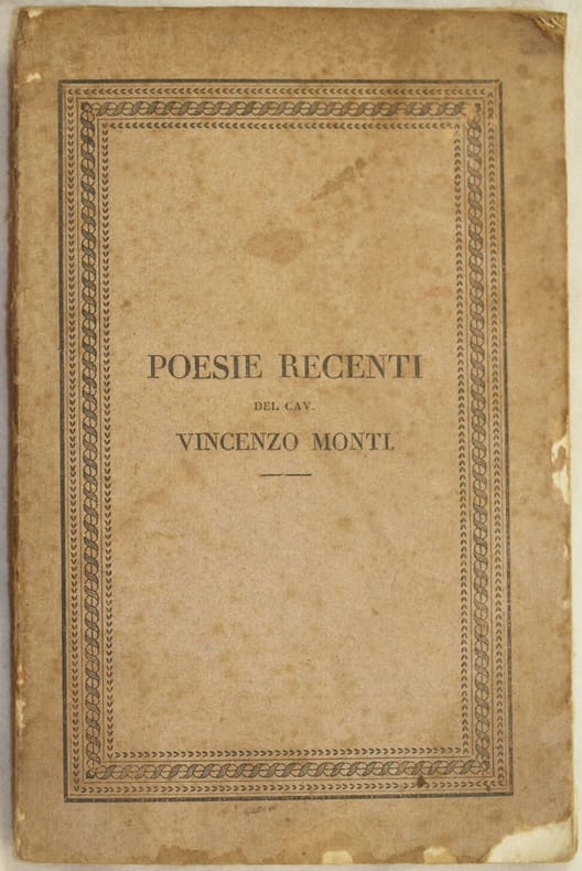 In 8. Dim. 22x14 cm. Pp. 39+(1). Seconda edizione coeva alla prima di questa raccolta di poesie di Vincenzo Monti (1754-1828). All'interno: I romantici sermone, Le nozze di Cadmo e di Ermione, Per le nozze dell'egregia donzella Adelaide Calderara col Signor Giacomo Butti. In discrete condizioni Copertina editoriale in mediocri condizioni generali con usure e parti mancanti ai margini e dorso. Piatto posteriore in parte staccato. Legatura in buone condizioni. All'interno le pagine si presentano in discrete condizioni con fioriture. Lievi gore d'umidità marginali. Second edition coeval to the first one of this collection of poems by Vincenzo Monti (1754-1828). Inside: I romantici sermone, Le nozze di Cadmo e di Ermione, Per le nozze dell'egregia donzella Adelaide Calderara col Signor Giacomo Butti. In fair conditions. Editorial cover in poor general conditions with wearings and missing parts in the edges and spine. Back plate partially detached. Binding in good conditions. Inside pages are in fair conditions with foxings. Slight water stains in the edges.
