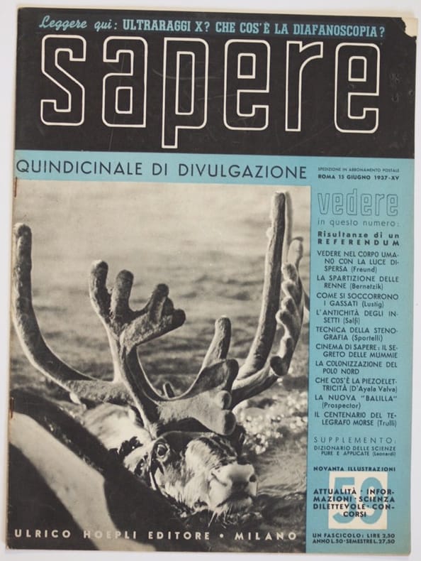 In folio. Dim. 32,5x24,5 cm. Pp. da 349 a 388. Numero del 15 giugno 1937 della piu antica rivista di divulgazione scientifica italiana fondata nel 1935. Tra gli articoli all'interno: Vedere nel corpo umano con la luce dispersa, Come si soccorrrono i gassati, insetti, tecnica della stenografia, Segreto delle mummie, Spartizione delle renne, La nuova Balilla ecc... Numerose foto e illustrazioni all'interno, pubblicita d'epoca (Iperfan, Condensatori Ducati, frigorifero Algidus, Magneti Marelli, Pirelli superextra, Pirelli stella bianca, Mobiloil, carburante Littoria ecc...). Brossura editoriale originale. In buone condizioni. Brossura editoriale in buone condizioni generali con lievi usure ai margini e dorso. (vedere foto). Legatura in buone condizioni. Pagine in buone condizioni con rare fioriture. Number of the 15th of june 1937 of the most ancient magazine of scientiphic divulgation established in 1935. Betweent the articles inside: to see in the human body with light, insects, stenography, segret of moms, division of deer, The new Balilla etc... Different photoes and illustrations inside (Iperfan, Condensatori Ducati, frigorifero Algidus, Magneti Marelli, Pirelli superextra, Pirelli stella bianca, Mobiloil, carburante Littoria). Original editorial cover. Editorial cover in good general conditions slightly worn in the edges and spine. Foxings. Binding in good conditions. Pages are in good conditions with occasional foxings.