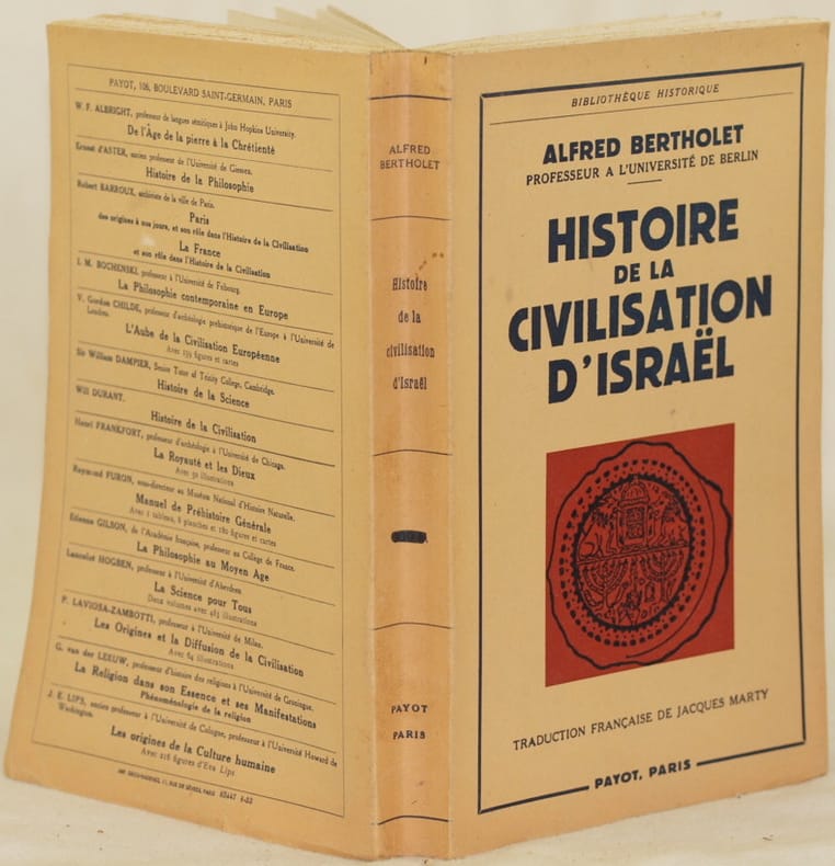 In 8. Dim. 22,5x14 cm. Pp. 435+(12). Edizione del 1953 di questa opera sulla storia della civiltà di Israele scritta da Alfred Bertholet. Traduzione francese a cura di Jacques Marty. L'autore descrive la storia dalla prima formazione di una civiltà israelita sedentaria fino alla descrizione della civilta di Israele in Palestina. In ottime condizioni. Copertina editoriale in ottime condizioni generali con lievi usure ai margini e dorso. Legatura in ottime condizioni. All'interno le pagine si presentano in ottime condizioni con rare fioriture, ancora da tagliare.Edition of 1953 of this work about the history of civilization of Israel written by Alfred Bertholet. French translation by Jacques Marty. The author describes the history from the first establishment of an israelitic fix organization until the description of the cvilization of Israel in Palestine. In very good conditions. Editorial cover in very good general conditions slightly worn in the edges and spine. Binding in very good conditions. Inside pages are in very good conditions with occasional foxings, still to be cut.