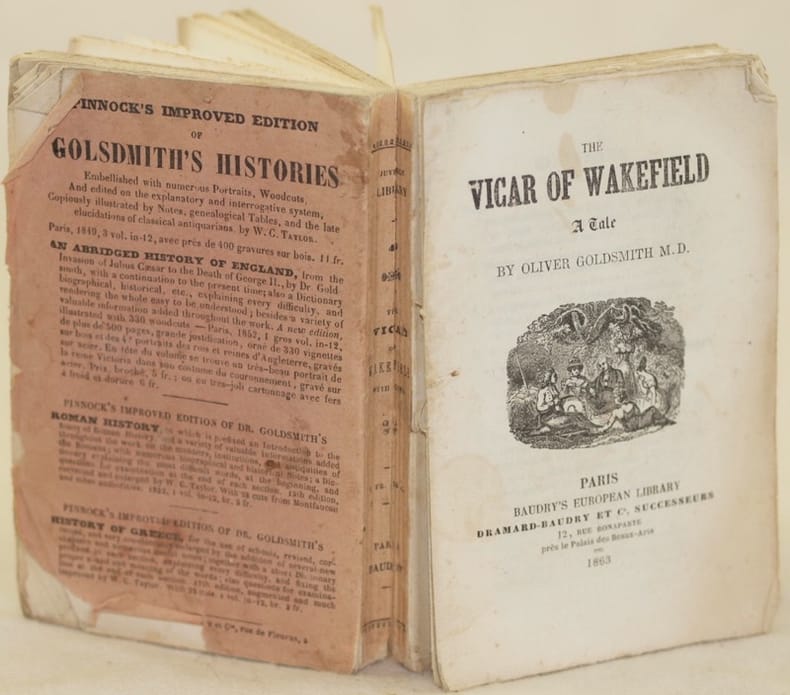 In 16. Dim. 15x9,5 cm. Pp. XIV+(2)+310. Edizione del 1863 di questa celebre opera del romanziere, poeta e commediografo Oliver Goldsmith (1728-1774). L'opera venne scritta dal 1761 al 1762 e venne pubblicata nel 1766. Alcune piccole illustrazioni, una delle quali al frontespizio. In discrete condizioni. Copertina editoriale in mediocri condizioni generali con usure e parti mancanti ai margini e dorso. Piatto anteriore assente. Legatura in discrete condizioni con rotture. All'interno le pagine si presentano in buone condizioni con fioriture. Edition of 1863 of this famous work by the novelist, poet and playwriter Oliver Goldsmith (1728-1774). The work was written from 1761 to 1762 and was published in 1766. Some little illustrations of which one is in the title page. In fair conditions. Editorial cover in poor general conditions with wearings and missing parts in the edges and spine. Front plate is missing. Binding in fair conditions with cracks. Inside pages are in good conditions with foxings.