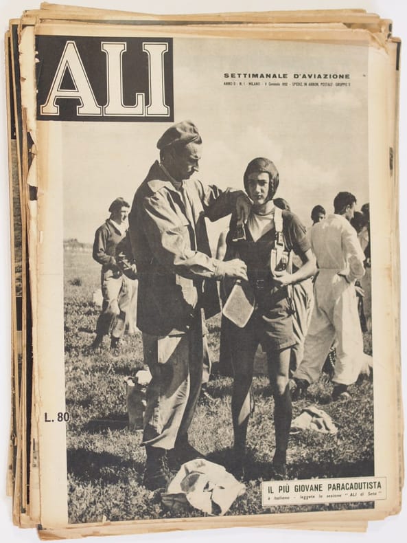 In folio. Dim. 40x30,5 cm. Pp. da 30 a 40+(4). Numero del 25 gennaio 1952 della rivista settimanale "Ali" di aviazione. "Ali" il periodico degli aviatori italiani nasce a Milano il 28 Marzo 1944 per essere pubblicato fino al 28 Aprile 1945 quando si interruppe a causa della guerra. Riappare nel 1951 fino al 1977 variando più volte di nome. Tra gli articoli presenti: Tecnica di riflesso, C.c.2 Caproni Campini Primato italiano, Aviazione cino coreana, Villaggio Milano, I delta di Lippisch a reazione, MAntova, LA morte è discesa a Hiroshima ecc...<BR>Numerose notizie di attualità e foto d'epoca all'interno.<BR>In buone condizioni. Copertina editoriale in buone condizioni generali con lievi usure ai margini e dorso. Legatura assente. All'interno le pagine si presentano in ottime condizioni con rare fioriture. Number of the 25th of january 1952 of the weekly magazine "Ali" of aviation.<BR>"Ali" the magazine of italian aviators was born in Milan the 28th of March 1944 to be published until the 28th of April 1945 when it was blocked due to the war. It reappeared in 1951 until 1977 changing names different times. Between the articles inside: Technique of reflexion, C.c.2 Caproni Campini Primato italiano, Aviation Chine Chorea, Village Milan, I delta di Lippisch, Mantova, death in Hiroshima ecc...<BR>Different information of actuality and photoes inside.<BR>In good conditions. Editorial cover in good general conditions slightly worn in the edges and spine. (see the photo). Binding is almost missing. Inside pages are in good conditions with occasional foxings.