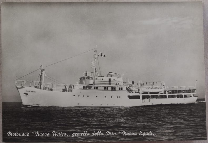 Bella cartolina fotografica degli anni '60 che mostra la nave "Nuova Ustica" gemella della Motonave "Nuova Egadi". In buone condizioni. In 24. Dim. cm 10,5x15.Interesting photographic postal card of 1960's showing "Nuova Ustica" twin of the boat "Nuova Egadi". In good conditions.