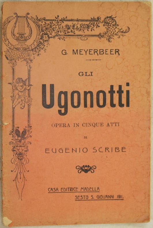 In 8. Dim. 20x13 cm. Pp. 52. Bel libretto d'opera dell'agosto 1884 di questa nota opera ambientata durante la notte di san Bartolomeo del compositore tedesco Giacomo Meyerbeer (1791-1864) compositore tedesco. L'opera venne rappresentata per la prima volta nel 1836. In discrete condizioni. Brossura editoriale in discrete condizioni generali con usure ai margini e dorso. Piatto posteriore staccato. Legatura in buone condizioni. All'interno le pagine si presentano in buone condizioni con rare fioriture. Beautiful booklet of august 1884 of this famous work placed in the Night of Saint Barthelemy by the german composer Giacomo Meyerbeer (1791-1864. The work was represented for the first time in 1836. In good conditions. Editorial cover in good general conditions slightly worn in the edges and spine. Back plate is detached. Binding in good conditions. Inside pages are in good conditions with occasional foxings.