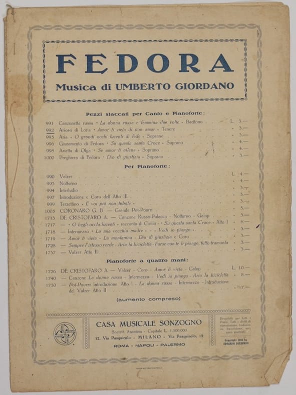 In 4. Dim. 34x25 cm. Pp. 3. Edizione dei primi del '900 della melodia "Arioso di Loris "Amor ti vieta"" tratto da "Fedora" opera lirica di Umberto Giordano (1867-1948). Opera per tenore con accompagnamento di pianoforte. In discrete condizioni. Copertina editoriale in mediocri condizioni generali con usure e parti mancanti ai margini e dorso. Legatura in mediocri condizioni con rotture. All'interno le pagine si presentano in buone condizioni con fioriture ed usure. Edition of the first years of 1900 of the melody "Arioso di Loris "Amor ti vieta"" taken from "Fedora" lyric work of Umberto Giordano (1867-1948). Work for tenore In fair conditions. Editorial cover in poor general conditions with wearings and missing parts in the edges and spine. Binding in poor conditions with cracks. Inside pages are in fair conditions with foxings and wearings.
