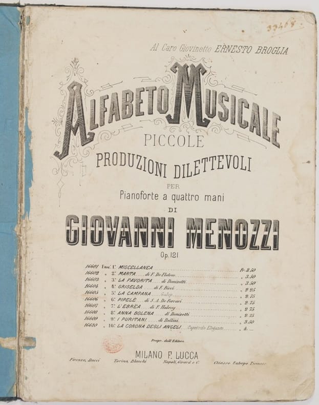 In 4. Dim. 33,5x25,5 cm. Pp. 7+3+5+1. Edizione del 1880 circa di questa raccolta di spartiti per pianoforte. Il primo è "La campana"spartito per pianoforte a quattro mani tratto dall'opera 121 di Giovanni Menozzi. Il secondo è "La chaine des roses" di J. Perno. Il terzo è "La favorita - Scritto è in ciel il mio dolor" dall'opera 71 di Giovanni Menozzi. Bellissimo frontespizio figurato. Il quarto (incompleto pagina 3 strappata) è "Cavatina Meco all'altare di Venere" di N. Paoletti. In discrete condizioni. Copertina in mezza tela in discrete condizioni generali con lievi usure ai margini e dorso. Legatura in buone condizioni. All'interno le pagine si presentano in discrete condizioni con rare fioriture e lievi gore d'umidità. Rinforzo al margine di piegatura di p. 2 del primo spartito. Strappo orizzontale riparato a pag. 9 e non riparato a p. 2 del 2° spartito. Ultima pagina mancante.