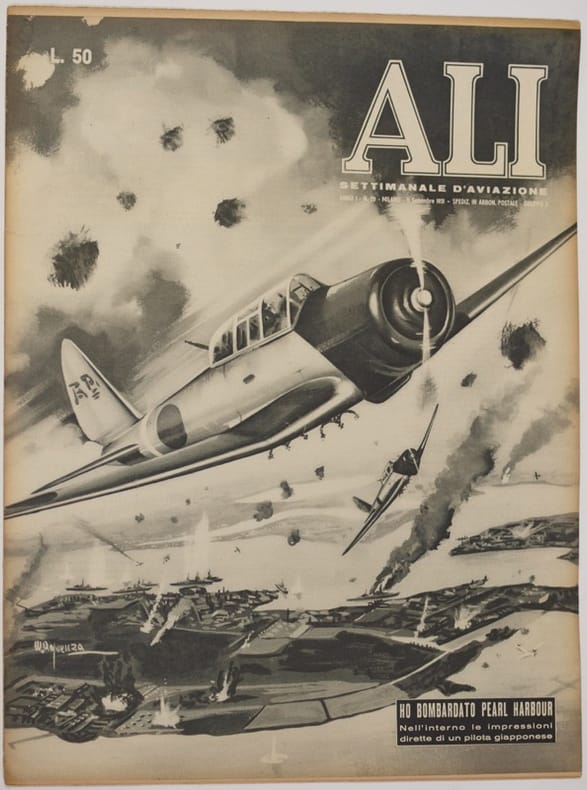 In folio. Dim. 40x30,5 cm. Pp. da 248 a 258+(4). Numero del 11 settembre 1951 della rivista settimanale "Ali" di aviazione."Ali" il periodico degli aviatori italiani nasce a Milano il 28 Marzo 1944 per essere pubblicato fino al 28 Aprile 1945 quando si interruppe a causa della guerra. Riappare nel 1951 fino al 1977 variando più volte di nome. Tra gli articoli presenti: ho bombardato Pearl Harbour, Il battello radiocomandato cala dal cielo, Le ali dell'anima di Fiume, Un Koblet di 30 anni fa ha costruito alianti, Roehn, Alianti in alta quota sulle Alpi, una cicogna sul Gran Sasso ecc... Numerose notizie di attualità e foto d'epoca all'interno. In buone condizioni. Copertina editoriale in buone condizioni generali con lievi usure ai margini e dorso. Piegatura orizzontale. Legatura quasi assente. All'interno le pagine si presentano in ottime condizioni con rare fioriture.Number of the 11th of september 1951 of the weekly magazine "Ali" of aviation. "Ali" the magazine of italian aviators was born in Milan the 28th of March 1944 to be published until the 28th of April 1945 when it was blocked due to the war. It reappeared in 1951 until 1977 changing names different times. Between the issues treated: I have bombed Pearl Harbour, Airplanes in Fiume, A Koblet of 30 years old built airplanes, Roehn, in Alps, Gran Sasso ecc... Different information of actuality and photoes inside. In good conditions. Editorial cover in good general conditions slightly worn in the edges and spine. Binding is almost missing. Inside pages are in very good conditions with occasional foxings.