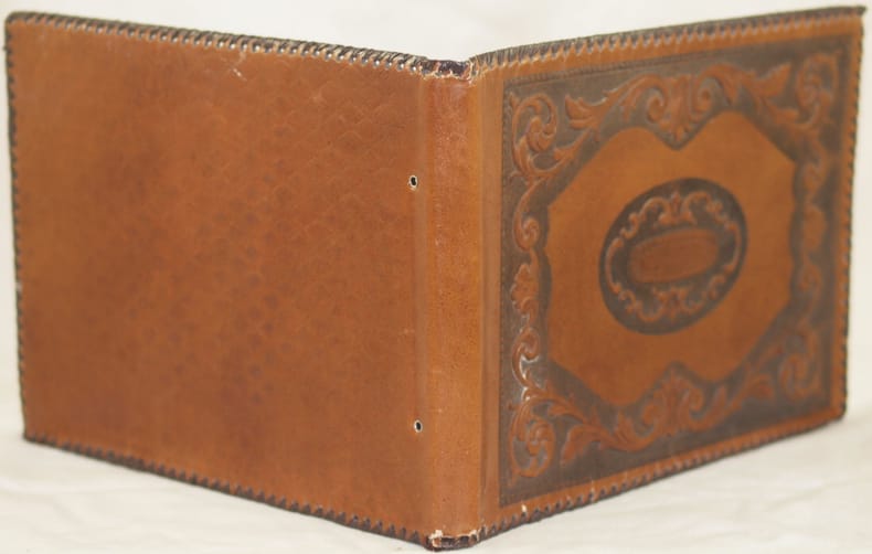 Bel raccoglitore per fotografie o cartoline in piena pelle degli anni '50 circa. Il piatto anteriore mostra lavorazione a rilievo, il posteriore finissima decorazione a secco. Il raccoglitore contiene otto fogli cartoncini coperti da velina, mai utilizzato.In ottime condizioni. In ottime condizioni. In 4. Dim. 25x33,5 cm. Pp. (16). Beautiful case for photoes in full leather of 1950's circa. In the front plate relief decorations, in the back plate very fine embosse decorations. The case contains eight carton pages covered by tissue paper, never used. In very good conditions. In 4. Dim. 25x33,5 cm. Pp. (16). Full leather cover with five nerfs in very good general conditions slightly worn in the edges and spine. Binding in very good conditions. Inside pages are in very good conditions with occasional foxings.