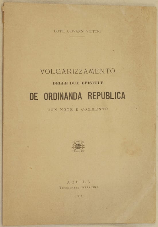 In 8. Dim. 22,5x16 cm. Pp. 43+(3).Interessante pubblicazione del 1897 sul volgarizzamento delle due epistole De Ordinanda Republica scritto dal Dott. Giovanni Vittori. Testo italiano con note e commento. Firma al frontespizio. In buone condizioni. Copertina editoriale in buone condizioni generali con lievi usure ai margini e dorso. Legatura in buone condizioni. All'interno le pagine si presentano in buone condizioni con rare fioriture.Interesting pamphlet of 1897 abotut he italian translation of the two letters De Ordinanda Republica written by Giovanni Vittori. Italian text with notes and comments. Signature in the title page. In good conditions. Editorial cover in good general conditions slightly worn in the edges and spine. Binding in good conditions. Inside pages are in good conditions with occasional foxings.