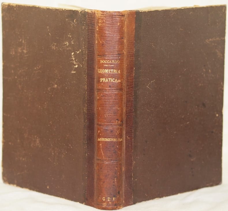 In 4. Dim. 27x20 cm. Pp. (6)+428+(4). Edizione del 1887 di questo trattato elementare di geometria pratica scritto da Ernesto Boccardo. L'opera era composta da due tomi, siamo purtroppo in possesso solo del primo tomo sull'agrimensura. All'interno: Della terra, Linee immaginarie, Rappresentazione geometrica di porzioni elementari di superficie terrestre, Rilevamento planimetrico, Planimetria strumenti e loro uso (lunghezze del terreno, squadri agrimensori, Bussola, grafometro, squadro graduato, tavoletta pretoriana, riduzione dei piani, Materiale e strumenti da disegnatore, misurazione, Applicazioni di planimetria, Livellazione ecc... Risultano purtroppo mancanti 40 pagine finali e 37 planches. In buone condizioni. Copertina in mezza pelle con titolo in oro al dorso in buone condizioni generali con lievi usure ai margini e dorso (vedere foto). Legatura in buone condizioni. All'interno le pagine si presentano in buone condizioni con fioriture. Edition of 1887 of this elementary treaty of practical geometry written by Ernesto Boccardo.<BR>The work was made up of two tomes, unfortunately we only have the first tome about agriculture. Inside: About earth, Imaginary lines, geometrical representation of portions of earth, Plane releving, Planimetry and its usage etc... Unfortunatele 40 final pages and 37 planches are missing. In good conditions. Half leather cover with golden title in the spine in good general conditions slightly worn in the edges and spine. Binding in good conditions. Inside pages are in good conditions with foxings.