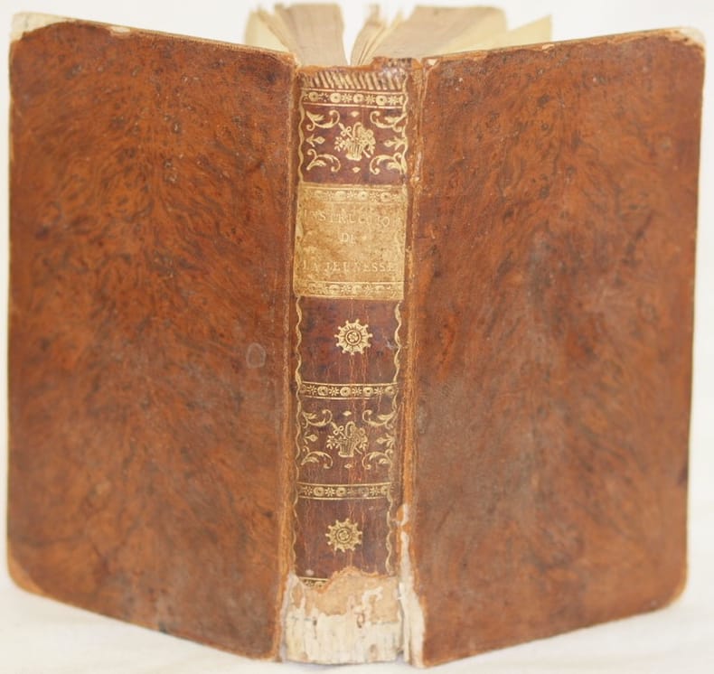 In 16. Dim. 17,5x10,5 cm. Pp. XI+456. Edizione del 1815 di questa interessante opera di pedagogia scritta da Charles Gobinet. Il volume inizia alla virtu e le preghiere, la lettura dei libri, giochi e cattive compagnie. L'opera è in un volume ed è completa. Tra gli argomenti trattati: Obblighi, mali che vengono dalla morte, peccati, demoni, preghiera, confessione, preghiere del mattino e della sera, assistenza alla Messa, Angelo custode, feste e domeniche, tentazioni, amore di Dio, docilità, castità, pudore, molestie, scelta dello stato di vita ecc... In buone condizioni. Copertina in piena pelle coeva con titolo e decorazioni in oro al dorso in buone condizioni generali con usure e parti mancanti ai margini e dorso. Piatto anteriore in parte staccato. Legatura in buone condizioni. All'interno le pagine si presentano in buone condizioni con rare fioriture. Bruniture. Edition of 1815 of this interesting work of pedagogy written by Charles Gobinet. The volume is a guide to vitues and prayers, readings of books, games and bad companies. The work is in one volume and it is complete Between the issues treated: Obligements, bad things from death, pities, demons, prayers, confession, prayers of morning and evening, assistance to Mass, feast and sundays, temptations, love of God, chastity, shame, violences, choice and state of life ecc... In good conditions. Full leather coeval cover with golden title and decorations in the spine in good general conditions with wearings and missing parts in the edges and spine. Front plate partially detached. Binding in good conditions. Inside pages are in good conditions with occasional foxings. Yellowings.