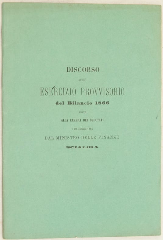 In 8. cm 22,5x15,5. Pp. 51+(3). Interessante pubblicazione del 1866 dell'economista e politico Antonio Scialoja (1817 - 1877). Laureatosi in giurispruedenza a Napoli nel 1841, divenne professore di economia politica all'Università di Torino nel 1846. Fu più volte ministro.<BR>Si tratta del discorso sull'esercizio provvisorio del bilancio 1866 detto da lui alla Camera dei deputati il 22 febbraio 1866. Alla fine della pubblicazione tre tabelle: Una è il quadro del prodotto tabacchi del 1865 confrontato con quello del 1864. Il secondo lista delle quantità e qualità dei tabacchi venduti negli anni 1865-1864 con i costi dell'amministrazione. La terza lista di varie merci vendute con minori o maggiori guadagni (acquavite, olio, teli di canapa e lino, mobili di legno, vetri, saponi, formaggi, libri legati e sciolti, lavori di moda, pesci ecc..). In buone condizioni. Copertina editoriale in ottime condizioni generali con lievi usure ai margini e dorso. Legatura in buone condizioni. Pagine in buone condizioni con fioriture. Interesting pamphlet of 1866 by the economist and politician Antonio Scialoja (1817 - 1877). He got a degree in law in Naples in 1841, he was teacher of political economy in the University of Turin in 1846. He was minister different time.<BR>It is a speech in Deputee Chamber the 22nd of february 1866.<BR>Three charts at the end of the pamphlet: The chart about sold tobaccoes in 1865 compared with 1864. The second one list of tobaccoes sold in 1865-1864 with expenses of administration. The third one list of goods sold with less or more incomes (oil, hemp or linen fabrics, wood furniture, glasses, soaps, fcheeses, books, fishes ecc..). In good conditions. Editorial cover in very good conditions slightly worn in the edges and spine. Binding in good conditions. Pages in good conditions with foxings.