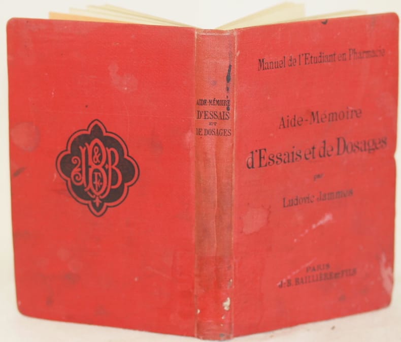 In 8 cm. 16x11. Pp. 320. Interessante volume di farmacia del 1893, un prontuario per l'utilizzo e le dosi di numerose sostanze utilizzate nei medicamenti, alimenti, prodotti fisiologici, patologici, agricoli e industriali scritto da Ludovic Jammes. Tra le sostanze descritte: oppio, cocciniglia, gomma arabica, ipecacuana, essenze, sciroppi, vini medicinali, digitale, unguenti, ammoniaca, alcaloidi vegetali, vini, liquori, olii, farina di frumento, carne, grasso di maiale, burro, miele, cioccolato, urina ecc... All'interno sono presenti 64 incisioni nel testo che mostrano strumenti. In buone condizioni. Copertina in tela editoriale in buone condizioni generali con lievi usure ai margini e dorso. Legatura in buone condizioni. All'interno le pagine si presentano in buone condizioni con rare fioriture. Interesting volume of pharmaceuticals of 1893, a pronctuary for the usage and measure of different substances used in medicines, food, physiological products, pathologycal agricultural and insustrial substances written by Ludovic Jammes. The substances described: opium, arabic gum, ipecacuana, essences, syrups, wines, liquors, oils, meat, pig fats, butter, honey, chocolate, urine etc... Inside there are 64 prints in the text showing instruments. In good conditions. Cloth editorial cover in good general conditions slightly worn in the edges and spine. Binding in good conditions. Inside pages are in good conditions with occasional foxings.