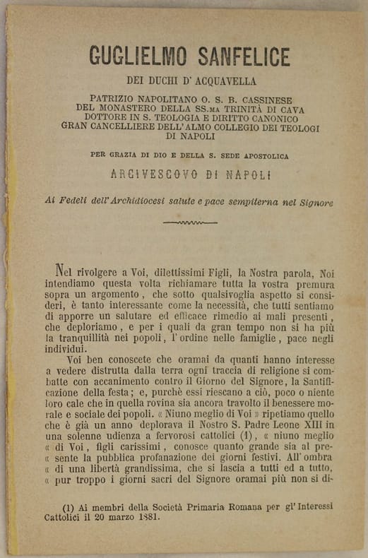 In 8. Dim. 25,5x17,5 cm. Pp. 7+(1). Pubblicazione senza data ma del 1880 circa, la lettera rivolta da Guglielmo Sanfelice dei Duchi d'Acquavella Arcivescovo di Napoli ai fedeli.<BR>Alla fine della lettera istruzioni per la Quaresima con le indicazioni per il consumo di carne e altre cibarie durante la Quaresima. In buone condizioni Copertina assente. Legatura quasi assente. All'interno le pagine si presentano in buone condizioni con rare fioriture. Piegatura verticale.Pamphlet not dated but of 1880 circa, the letter of Guglielmo Sanfelice dei Duchi d'Acquavella archibyshop of Naples to faithful people.<BR>At the end of the letter instructions for Eastern with indications about the consumption of meat and food during Eastern period. In good conditions Cover is missing. Binding is almost missing. Pages in good condiitons with occasional foxings. Vertical folding.