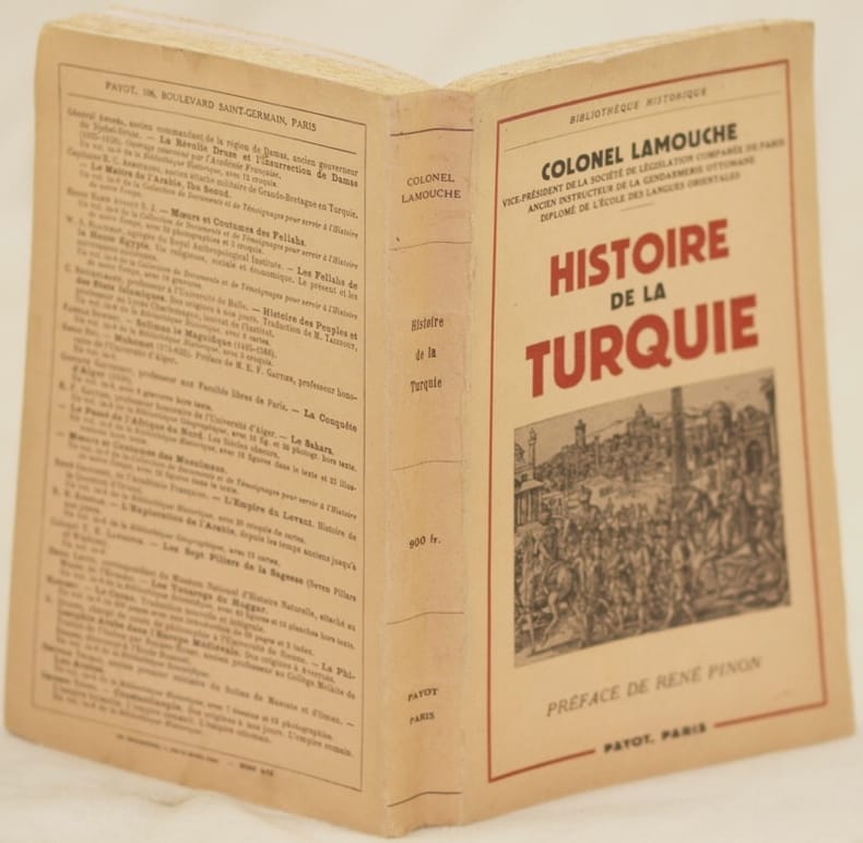 In 8. Dim. 22,5x14,5 cm. Pp. 442. Edizione del 1953 di questa opera storia sulla Turchia scritta da Colonel Lamouche. L'autore analizza la storia della Turchia dalle origini ai giorni nostri.<BR>Prefazione di Rene Pinon. In buone condizioni. Copertina editoriale in buone condizioni generali con leggere usure ai marginie dorso (vedere foto). Legatura in buone condizioni. All'interno le pagine si presentano in ottime condizioni con rare fioriture.Edition of 1953 of this work about Turkey written by Colonel Lamouche.<BR>The author analyzes the history of Turkey from origins to present days.<BR>Prefation by Rene Pinon. In good conditions. Editorial cover in good general conditions slightly worn in the edges and spine. Binding in good conditions. Inside pages are in very good conditions with occasional foxings.