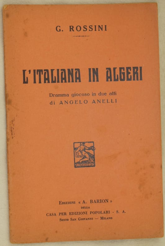 In 16. Dim. 18,5x12 cm. Pp. 32. Bel libretto d'opera del 1934 dell'opera "L'italiana in Algeri" di Gioachino Rossini (1792-1868) su libretto di Angelo Anelli.<BR>La prima rappresentazione ebbe luogo il 22 maggio 1813 al Teatro San Benedetto di Venezia.<BR>In buone condizioni. Brossura editoriale in buone condizioni generali con lievi usure ai margini e dorso. Macchie (vedere foto). Legatura in buone condizioni. All'interno le pagine si presentano in buone condizioni con fioriture.Beautiful booklet of 1934 of the work "L'Italiana in Algeri" by Wolfgang Amadeus Mozart (1756-1791) on booklet by Angelo Anelli The first representation took place the 22nd of may 1813 in the Theatre San Benedetto of Venice. In good conditions. Editorial cover in good general conditions slightly worn in the edges and spine. Stains. Binding in good conditions. Inside pages are in good conditions with foxings.