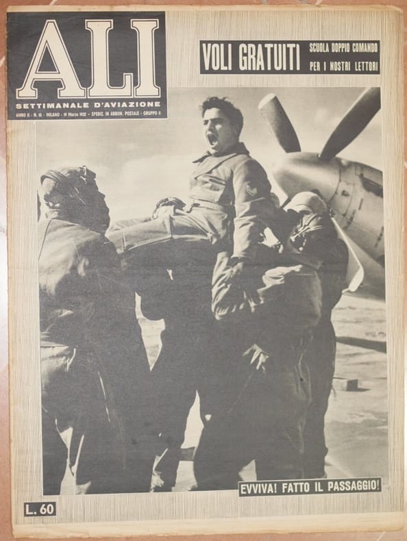 In folio. Dim. 40x30,5 cm. Pp. da 118 a 128+(4). Numero del 19 marzo 1952 della rivista settimanale "Ali" di aviazione. "Ali" il periodico degli aviatori italiani nasce a Milano il 28 Marzo 1944 per essere pubblicato fino al 28 Aprile 1945 quando si interruppe a causa della guerra.<BR>Riappare nel 1951 fino al 1977 variando più volte di nome.<BR>Tra gli articoli presenti: opinione di Jabara, Furio Niclot, gli aerei razzo tedeschi, piccola attività invernale, modelli in scala telecomandati e a volo libero, aeromodellismo a Genova, Thunderjet in Europa, Atterraggi su sci ecc.. Numerose notizie di attualità e foto d'epoca all'interno.<BR>In buone condizioni. Copertina editoriale in buone condizioni generali con lievi usure ai margini e dorso. Piatti staccati. Legatura assente. All'interno le pagine si presentano in ottime condizioni con rare fioriture. Number of the 19th of march 1952 of the weekly magazine "Ali" of aviation.<BR>"Ali" the magazine of italian aviators was born in Milan the 28th of March 1944 to be published until the 28th of April 1945 when it was blocked due to the war.<BR>It reappeared in 1951 until 1977 changing names different times.<BR>Between the articles inside: opinion of Jabara, Furio Niclot, german airplanes, little winter activity, models in scale, airmodeling in Genova, Thunderjet in Europe, Sky landing ecc...<BR>Different information of actuality and photoes inside.<BR>In good conditions. Editorial cover in good general conditions slightly worn in the edges and spine. plates are missing(see the photo). Binding is missing. Inside pages are in good conditions with occasional foxings.