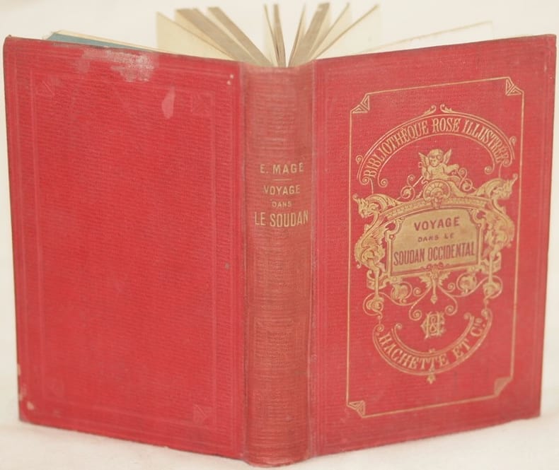 Un volume in-12°, reliure rigide de percaline couleur rouge-rosé, habituelle dans cette collection de la bibliothèque rose illustrée, avec un premier plat orné d’un motif lui aussi habituel (un angelot doré tenant des monstres en laisse). L’ouvrage s’ouvre sur un catalogue des titres de la collection des voyages de la Bibliothèque rose, catalogue particulièrement intéressant puisque la France de cette époque allait de découvertes en découvertes et de conquêtes en conquêtes. Vient ensuite, en frontispice, le portrait du Lieutenant MAGE, l’auteur de cet ouvrage, mort dans le naufrage tragique du vaisseau qu’il commandant, la Gorgone, en décembre 69 à l’âge de 33 ans. Une très intéressante introduction de J. Belin de Launay (ppI- XXVIII) commence l’ouvrage proprement dit: elle nous informe en détails des projets coloniaux de la France dans les régions du haut Soudan et du haut Niger . L’idée étant de trouver la route la plus courte pour relier les fleuves Sénégal et Niger afin de pouvoir éventuellement dériver vers des comptoirs commerciaux français, éventuellement sur la côte atlantique toutes les richesses provenant de l’intérieur de l’Afrique. L’ouvrage compte 303 pages et se termine par une carte dépliante du Soudan occidental dressée par E. MAGE, avec l’itinéraire de ses deux voyages (le 1er voyage en 1859-60, le 2ème en 1863-66 , en compagnie du Docteur QUINTIN) . Exemplaire complet de ses 16 gravures et de sa carte, avec certes quelques rares rousseurs mais avec une reliure éditeur en TRÈS BEL ETAT.