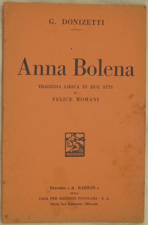 In 16. Dim. 18,5x12 cm. Pp. 32. Bel libretto d'opera del 1933 dell'opera "Anna Bolena" di Gaetano Donizetti (1797-1848) su libretto di Saint Georges e Bayard.<BR>La prima rappresentazione ebbe luogo il 26 dicembre 1830 al Teatro Carcano di Milano.<BR>In buone condizioni. Brossura editoriale in buone condizioni generali con lievi usure ai margini e dorso. Macchie (vedere foto). Legatura in buone condizioni. All'interno le pagine si presentano in buone condizioni con fioriture. Beautiful booklet of 1933 of the work in three acts "Anna Bolena" by Gaetano Donizetti (1797-1848).<BR>The first representation took place the 26th of december 1830 in theatre Carcano in Milan.<BR>In good conditions. Editorial cover in good general conditions slightly worn in the edges and spine. Stains. (see the photo). Binding in good conditions. Inside pages are in good conditions with foxings.
