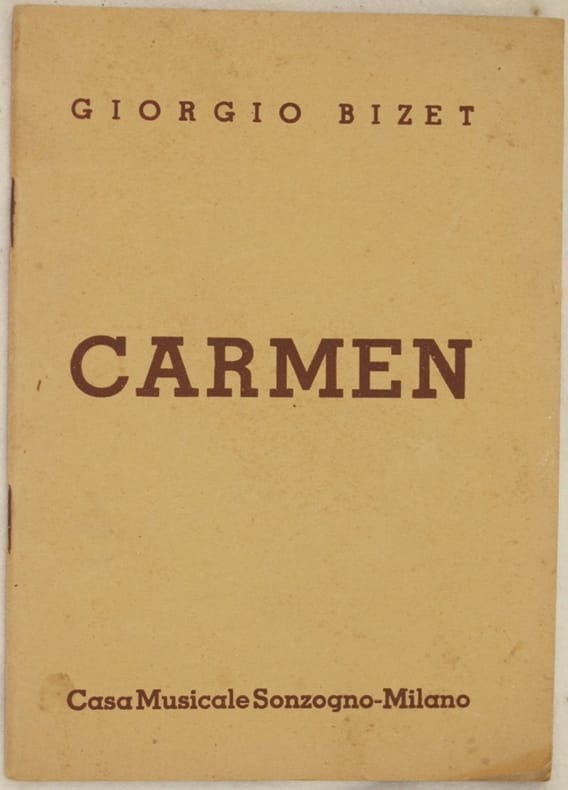 In 16. Dim. 18,5x14 cm. Pp. 48. Edizione del 1937 del libretto d'opera Carmen di George Bizet (1838-1875). L'opera venne rappresentata per la prima volta il 3 marzo 1875 dell'Opera Comique di Parigi.<BR>In ottime condizioni. Copertina editoriale in ottime condizioni generali con lievi usure ai margini e dorso. Legatura in buone condizioni. All'interno le pagine si presentano in ottime condizioni con rare fioriture. Edition of 1937 of this booklet Carmen by George Bizet (1838-1875). The work was represented for the first time the 3rd of march 1875 of the Opera Comique of Paris.<BR>In very good conditions. Editorial cover in good general conditions slightly worn in the edges and spine. Binding in good conditions. Inside pages are in good conditions with occasional foxings.