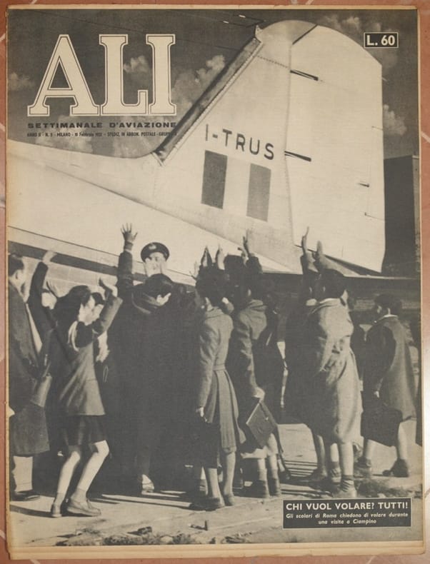 In folio. Dim. 40x30,5 cm. Pp. da 58 a 68+(4). Numero del 10 febbraio 1952 della rivista settimanale "Ali" di aviazione.<BR>"Ali" il periodico degli aviatori italiani nasce a Milano il 28 Marzo 1944 per essere pubblicato fino al 28 Aprile 1945 quando si interruppe a causa della guerra.<BR>Riappare nel 1951 fino al 1977 variando più volte di nome.<BR>Tra gli articoli presenti: Vita dura sulle portaerei, I Vampire in Eritrea, Safir, La prima trasvolata del Monte Bianco, Aero Club Rieti, Organizzazione meteorologica, Aviazione da soccorso, Giovanni Pezzani, On. Malintoppi a Nisida e Caserta, Biella ecc..<BR>Numerose notizie di attualità e foto d'epoca all'interno.<BR>In buone condizioni. Copertina editoriale in buone condizioni generali con lievi usure ai margini e dorso. Legatura assente. All'interno le pagine si presentano in ottime condizioni con rare fioriture. Number of the 10th of february 1952 of the weekly magazine "Ali" of aviation.<BR>"Ali" the magazine of italian aviators was born in Milan the 28th of March 1944 to be published until the 28th of April 1945 when it was blocked due to the war.<BR>It reappeared in 1951 until 1977 changing names different times.<BR>Between the articles inside: Hard life on airplanes, Vampires in Eritrea, Safir, First flight upon Monte Bianco, Aero Club Rieti, Meteorlogical organisation, First aid aviation, Giovanni Pezzani, On. Malintoppi in Nisida and Caserta, Biella ecc... Different information of actuality and photoes inside.<BR>In good conditions. Editorial cover in good general conditions slightly worn in the edges and spine. (see the photo). Binding is missing. Inside pages are in good conditions with occasional foxings.