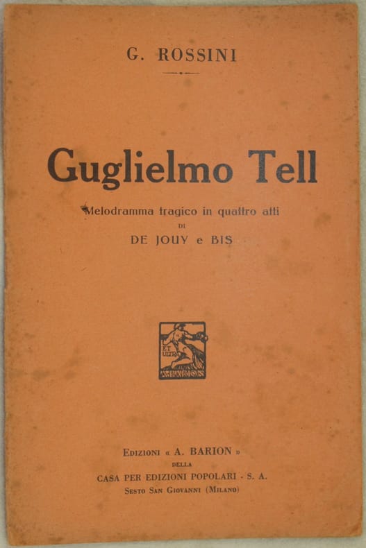 In 8. Dim. 20x13,5 cm. Pp. 32. Bel libretto d'opera del 1933 dell'opera in quattro atti "Guglielmo Tell" di Gioachino Rossini (1792-1868) su libretto di Jouy e Bis dal dramma di Friedrich Schiller.<BR>La prima rappresentazione ebbe luogo all'Opera di Parigi il 3 Agosto 1829, la prima italiana a Lucca il 17 settembre 1831. In buone condizioni. Brossura editoriale in buone condizioni generali con lievi usure ai margini e dorso (vedere foto). Legatura in buone condizioni. All'interno le pagine si presentano in ottime condizioni con rare fioriture. Beautiful booklet of 1933 of the work in four acts "Guglielmo Tell" by Gioachino Rossini (1792-1868) on booklet by Jouy e Bis from the drama by Friedrich Schiller. The first representation took place in the Opera in Paris the 3rd of august 1829, the first italian representation in Lucca the 17th of september 1831. In good conditions. Editorial cover in good general conditions slightly worn in the edges and spine (see the photo). Binding in good conditions. Inside pages are in very good conditions with occasional foxings.