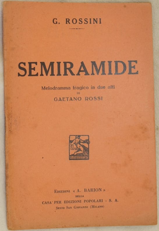 In 16. Dim. 18,5x12,5 cm. Pp. 32. Bel libretto d'opera del 1933 dell'opera in due atti "Semiramide" di Gioachino Rossini (1792-1868) su libretto di Gaetano Rossi.<BR>La prima rappresentazione ebbe luogo al Teatro la Fenice di Venezia il 3 febbraio 1823.<BR>In buone condizioni. Brossura editoriale in buone condizioni generali con lievi usure ai margini e dorso. Legatura in buone condizioni. All'interno le pagine si presentano in ottime condizioni con rare fioriture. Beautiful booklet of 1933 of the work in two acts "Semiramide" by Gioachino Rossini (1792-1868) on booklet by Gaetano Rossi. The first representation took place in the Teatro la Fenice di Venezia the 3rd of february 1823. In good conditions. Editorial cover in good general conditions slightly worn in the edges and spine. Binding in good conditions. Inside pages are in very good conditions with occasional foxings.