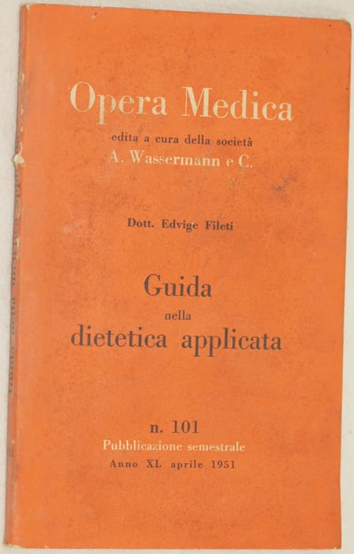 In 16. cm 18x11,5. Pp. 159+(1). Interessante volume di medician edito dalla società "A. Wassermann" sulla dietetica applicata scritto dal Dott. Edvige Fileti. All'interno principi di alimentazione e dieta e malattie associate. Numerose ricette alla fine del volume. In discrete condizioni Copertina editoriale in discrete condizioni generali con lievi usure ai margini. Macchie. Legatura in mediocri condizioni con rotture. Pagine in buone condizioni con rare fioriture. Interesting volume of medicine edited by the society "A. Wassermann" about applied diet witten by Dott. Edvige Fileti.<BR>Inside principles of food and diet and associated deseases. Different recipes at the end of the volume. In fair conditions. Editorial cover in fair general conditions slightly worn in the edges and spine. Stain. Binding in poor conditions with cracks. Pages in good conditions with occasional foxings.