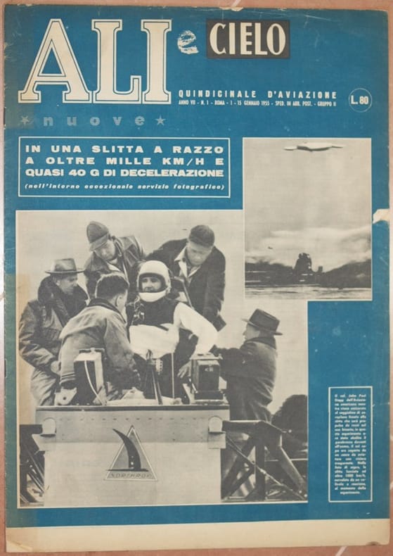 In folio. Dim. 39x27,5 cm. Pp. 16+(4). Numero del 1-15 gennaio 1955 della rivista settimanale "Ali" di aviazione. "Ali" il periodico degli aviatori italiani nasce a Milano il 28 Marzo 1944 per essere pubblicato fino al 28 Aprile 1945 quando si interruppe a causa della guerra. Riappare nel 1951 fino al 1977 variando più volte di nome. Tra gli articoli presenti: Strane sagome nel cielo della sconfitta, La più grande aviorimessa del mondo a Bourget, Aeromodellismo 1954, L'aviatore sul fiume, Formosa Danzica d'Oriente, Al di la dei mille all'ora in una slitta a razzo, Zippy aeromodello da sala, costruitevi un G. 46, Tecnica delle microonde ecc.. Numerose notizie di attualità e foto d'epoca all'interno.<BR>In buone condizioni. Copertina editoriale in buone condizioni generali con lievi usure ai margini e dorso. Legatura assente. All'interno le pagine si presentano in ottime condizioni con rare fioriture. Number of the 1-15 of january 1955 of the weekly magazine "Ali" of aviation.<BR>"Ali" the magazine of italian aviators was born in Milan the 28th of March 1944 to be published until the 28th of April 1945 when it was blocked due to the war. It reappeared in 1951 until 1977 changing names different times. Between the articles inside: In the sky of defeat, The biggest deposit of airplanes in Bourget, Airmodelism 1954, Aviator in the river, Formosa Danzica d'Oriente, Al di la dei mille all'ora in una slitta a razzo, Zippy airmodelist, G. 46, tEchnique of microwaves ecc... Different information of actuality and photoes inside. In good conditions. Editorial cover in good general conditions slightly worn in the edges and spine. Binding in good conditions. Inside pages are in good conditions with occasional foxings.