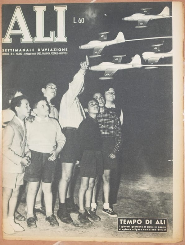 In folio. Dim. 40x30,5 cm. Pp. da 156 a 164+(6). Numero del 24 maggio 1953 della rivista settimanale "Ali" di aviazione.<BR>"Ali" il periodico degli aviatori italiani nasce a Milano il 28 Marzo 1944 per essere pubblicato fino al 28 Aprile 1945 quando si interruppe a causa della guerra.<BR>Riappare nel 1951 fino al 1977 variando più volte di nome.<BR>Tra gli articoli presenti: La prima traversata senza motore degli Appennini, Il Messerschmitt ME 109, Nisida, I paracadutisti di Nicelli, I primi radar italiani per il NATO ecc..<BR>Numerose notizie di attualità e foto d'epoca all'interno.<BR>In buone condizioni.<BR>Copertina editoriale in buone condizioni generali con lievi usure ai margini e dorso. Legatura assente. All'interno le pagine si presentano in ottime condizioni con rare fioriture. Number of the 24th of may 1953 of the weekly magazine "Ali" of aviation.<BR>"Ali" the magazine of italian aviators was born in Milan the 28th of March 1944 to be published until the 28th of April 1945 when it was blocked due to the war.<BR>It reappeared in 1951 until 1977 changing names different times.<BR>Between the articles inside: the first flight of Appennini, Messerschmitt ME 109, Nisida, parachuting of Nicelli, the first italian radars for NATO ecc...<BR>Different information of actuality and photoes inside.<BR>In good conditions. <BR>Editorial cover in good general conditions slightly worn in the edges and spine. (see the photo). Binding is missing. Inside pages are in good conditions with occasional foxings.