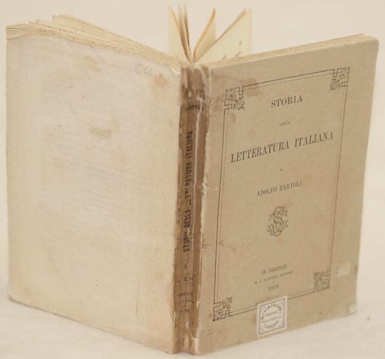 Firenze, Sansoni 1878 [viii +] 341pp., dans la série "Storia della Letteratura italiana" (Tomo primo), couv.cart. (dos en toile, plats marbrés), 19cm., bon état