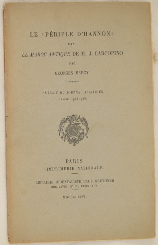 In 8. cm 22,5x14. Pp. 57. Interessante pubblicazione del 1947 sul "Periple d'Hannon" nell'opera "Le Maroc antique" di M. J: Carcopino a cura di Georges Marcy. <BR>il "Periple d'Hannon" è la relazione di un viaggio effettuato da una flotta cartaginese capitanata da Hannon in un'epoca non determinata. Durante la spedizione si colonizzò almeno parte della Costa atlantica dell'Africa. Estratto dal "Journal asiatique" annees 1943-1945.<BR>In ottime condizioni. Copertina editoriale in ottime condizioni con lievi usure ai margini e dorso. Legatura in buone condizioni. Pagine in buone condizioni con fioriture.Interesting pamphlet of 1947 about "Periple d'Hannon" in the work "Le Maroc antique" by M. J: Carcopino by Georges Marcy. <BR>The "Periple d'Hannon" is a report of travel made by a Carthago ships in a not specifid period. During the expedition part of Atlantic Coast of Africa was colonized.<BR>Extract from "Journal asiatique" annees 1943-1945.<BR>In very good conditions. Editorial cover in very good general conditions slightly worn in the edges and spine. Binding in good conditions. Pages in good conditions with foxings.